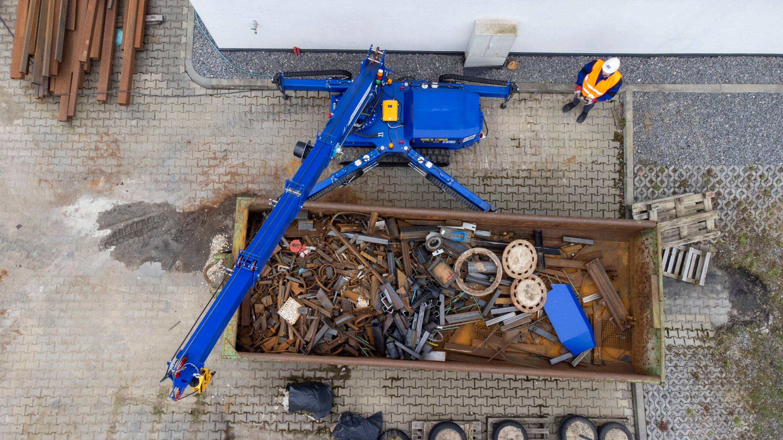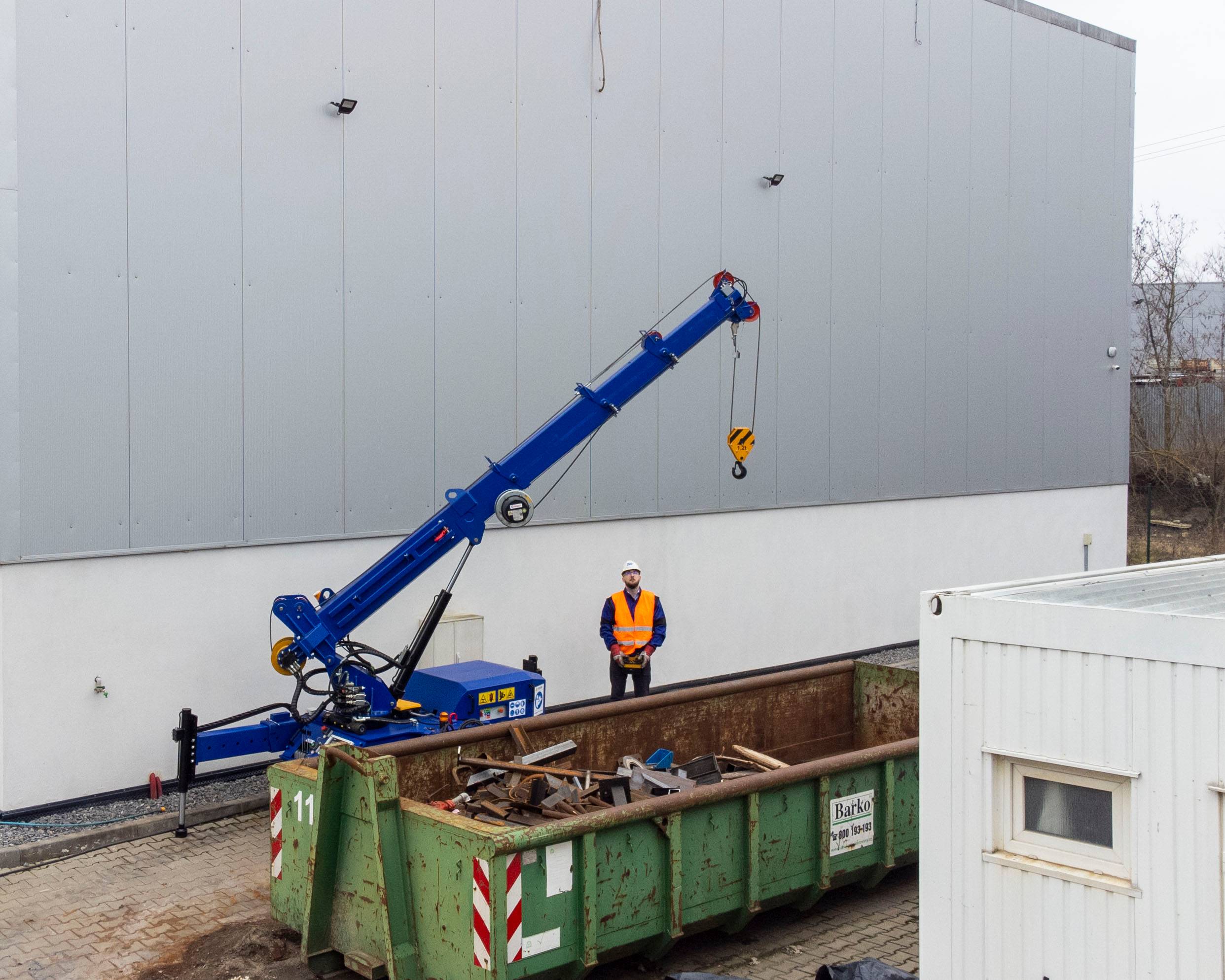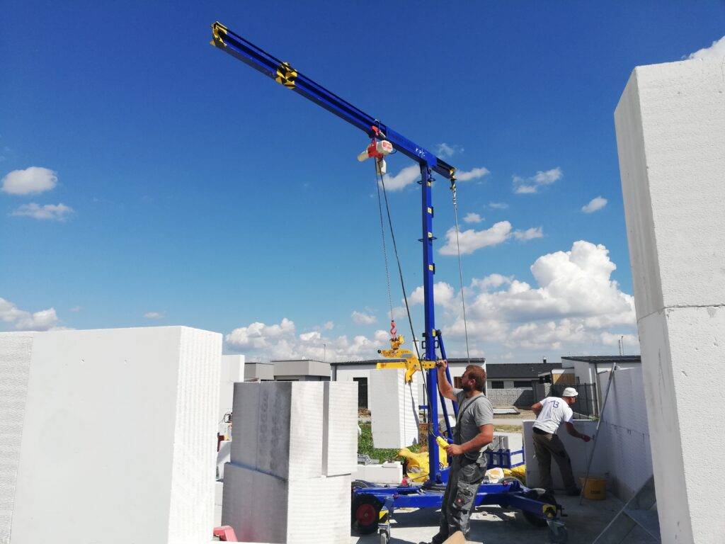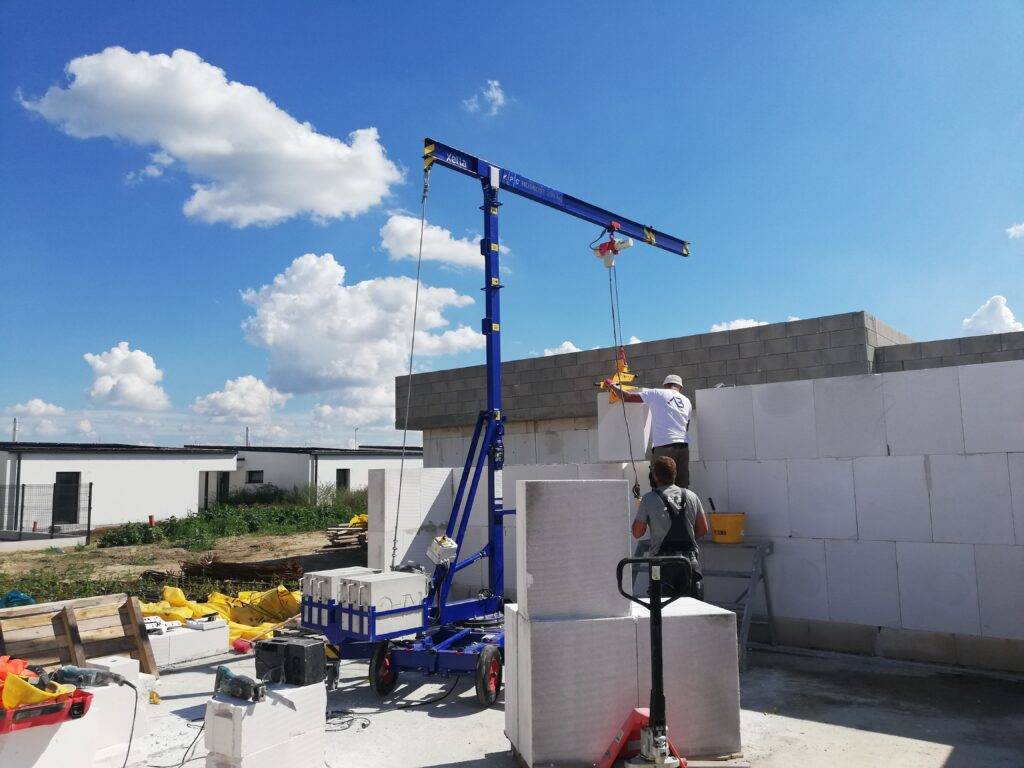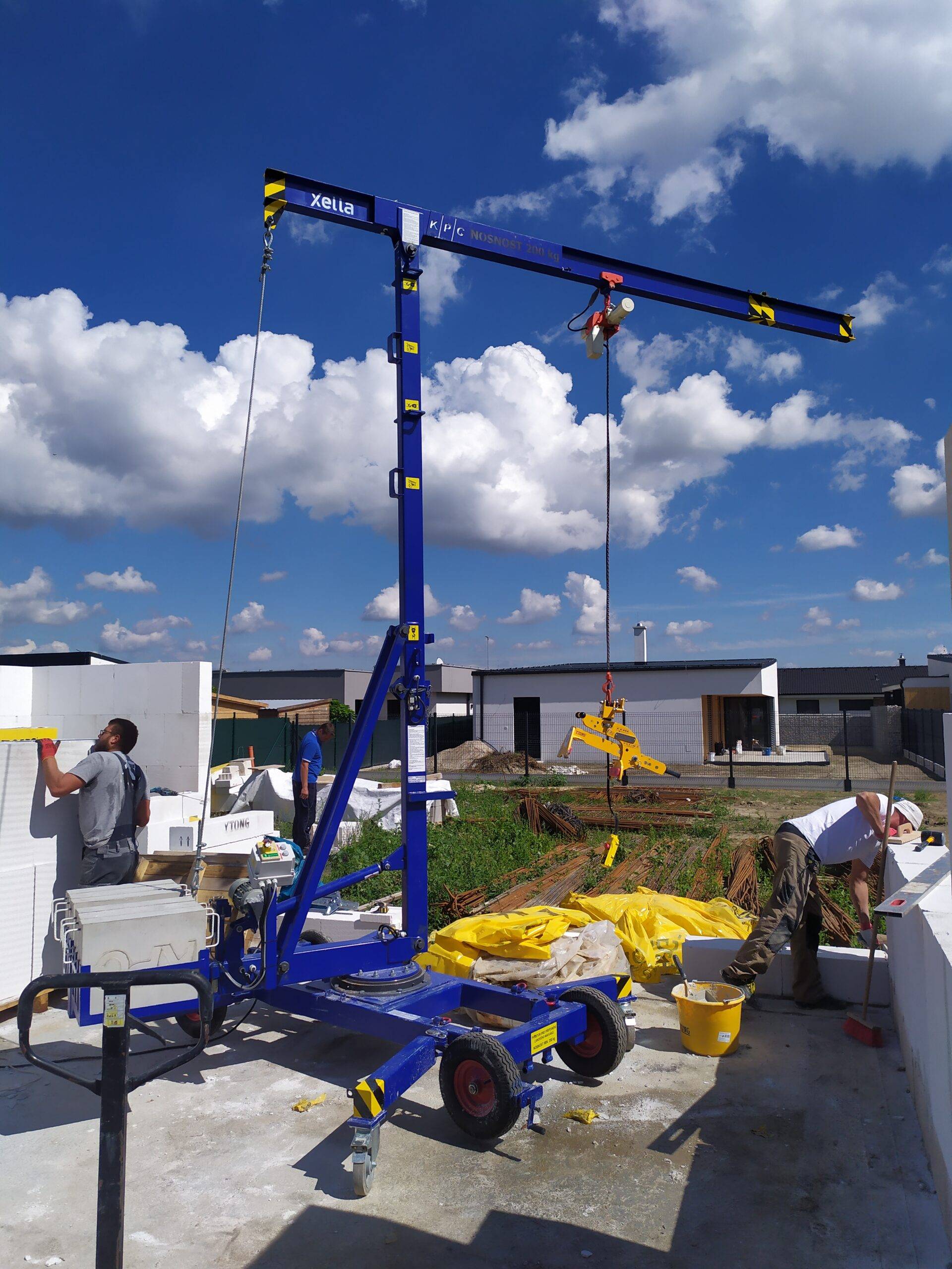 It is mounted on a mobile chassis that can be transported by conventional transport equipment and is quickly set up on site using support feet and spread by a hydraulic cylinder. It is typically used for handling formwork, prefabricated products, reinforcement, process units or material on site.