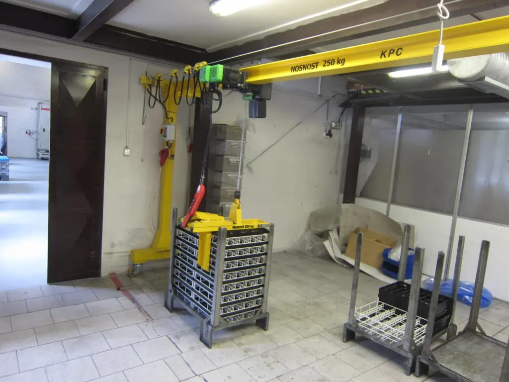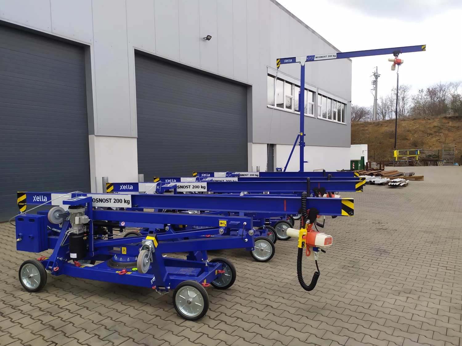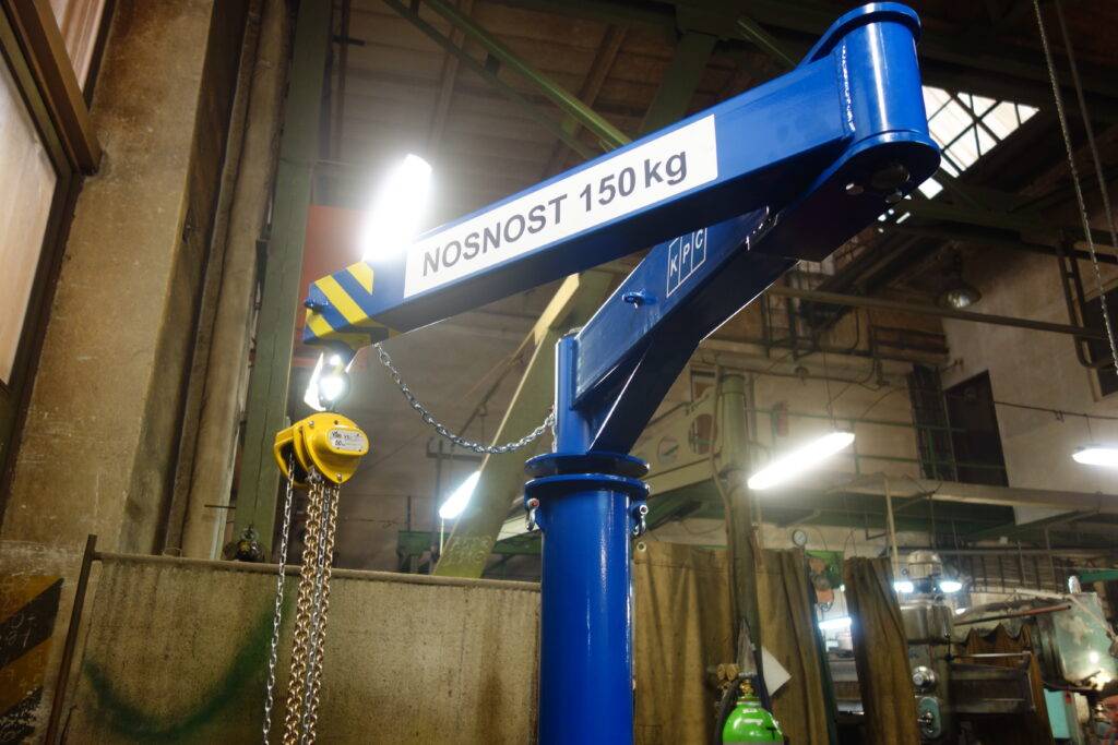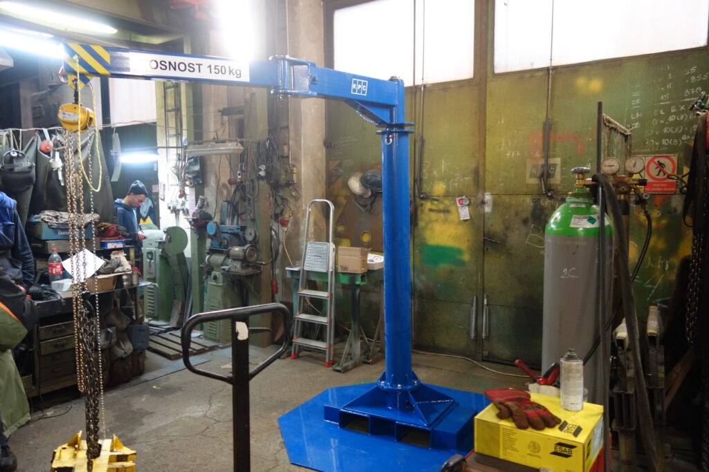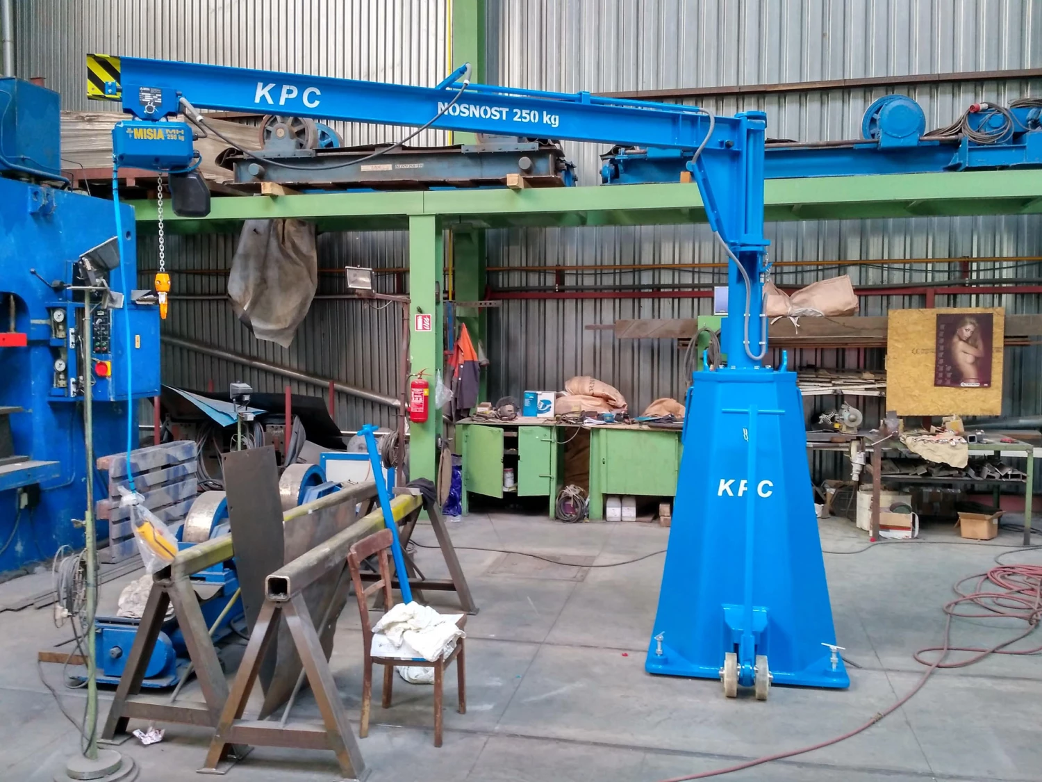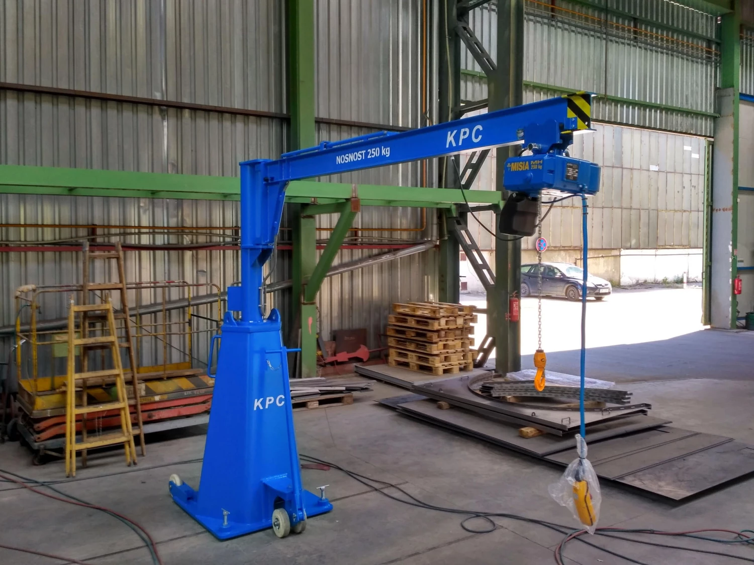 The crane has a solid base and can be easily moved by pallet truck, forklift or by hanging on an overhead crane. The design consists of a base, a column and a swivel boom, at the end of which a manual or electric chain hoist is permanently suspended.