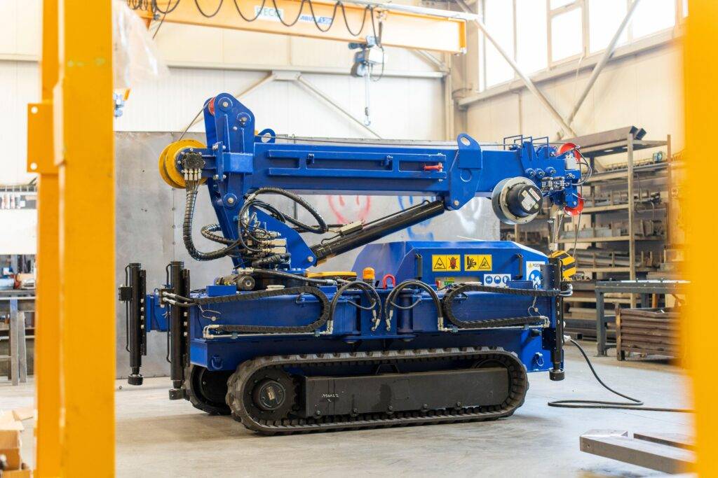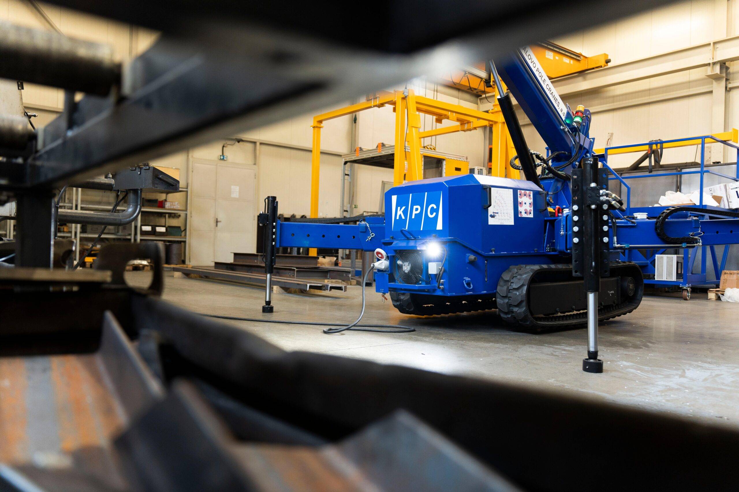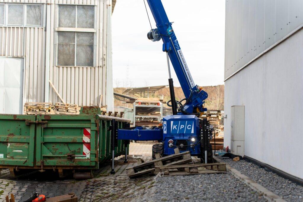 The KPC-MJ1200 crawler crane is a compact crane with a telescopic boom on a crawler chassis, designed for handling in space-constrained operations where a conventional crane cannot be used. Within the working area it is self-propelled, lifting and moving loads using radio remote control of all working movements.